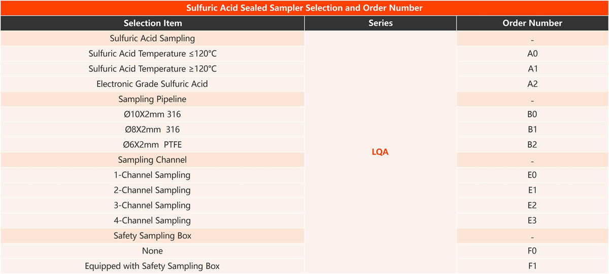 The LQA Sulfuric acid closed sampler is designed to meet the sampling needs of a wide range of acid production processes and is suitable for sampling sulfuric acid from 0% to 100% concentration and fuming sulfuric acid. The equipment can effectively solve the problems of safety hazards, environmental pollution and the management of raw materials which may be encountered in the process of sulfuric acid analysis and sampling.