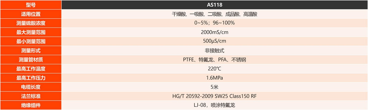 AS118傳感器適用于高溫酸、干燥酸、一吸酸、成品酸以及稀釋硫酸等多種環(huán)境下的應(yīng)用。該傳感器的測(cè)量準(zhǔn)確性不受介質(zhì)流速和流向的影響,但無(wú)法測(cè)量含有氣體的介質(zhì)電導(dǎo)率因此必須確保測(cè)量介質(zhì)是流動(dòng)的且不含氣體。AS118傳感器的測(cè)量管采用不銹鋼材質(zhì)并內(nèi)襯聚四氟乙烯,安裝法蘭由耐腐蝕材料制成,而溫度傳感器作為獨(dú)立元件,安裝在傳感器出口的溫度套管中。傳感器的感應(yīng)線圈則安裝在內(nèi)襯聚四氟乙烯的測(cè)量管外部,允許高溫硫酸或堿液等介質(zhì)在測(cè)量管內(nèi)部流動(dòng)。
