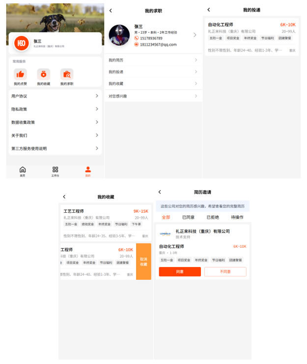 選擇“求職者”身份后,在“我的”頁面會(huì)出現(xiàn)“我的求職”功能入口。其中包括五個(gè)板塊: