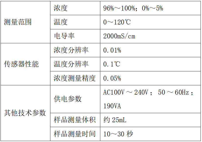 便攜式酸濃度分析儀具備高達(dá)0.01%的分辨率和0.05%的精確度,其測量范圍覆蓋96%至100%或0%至5%(詳細(xì)參數(shù)請參見表1)。需要注意的是,環(huán)境濕度可能會影響其性能,因為濃硫酸在取樣后吸水可能會導(dǎo)致測量誤差增加。