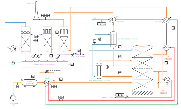 大規(guī)模生產(chǎn)硫酸主要通過兩種方法:冶煉煙氣制酸和硫磺制酸。冶煉煙氣制酸利用冶煉過程中副產(chǎn)的二氧化硫(SO2),通過轉(zhuǎn)化反應(yīng)釋放的熱量來維持系統(tǒng)所需溫度。在這一過程中,關(guān)鍵控制環(huán)節(jié)包括煙氣的凈化、二氧化硫的轉(zhuǎn)化以及三氧化硫(SO3)的吸收。另一方面,硫磺制酸則是通過燃燒液態(tài)硫磺產(chǎn)生二氧化硫,并釋放大量熱量,隨后利用余熱鍋爐移除煙氣中的熱量,產(chǎn)生過熱蒸汽。煙氣接著通過轉(zhuǎn)化器和吸收塔完成制酸過程。盡管煙氣制酸和硫磺制酸都采用相同的二氧化硫轉(zhuǎn)化和三氧化硫吸收工藝,但它們?cè)谠仙珊陀酂徨仩t的使用上存在差異。冶煉煙氣制酸的凈化工藝控制流程中沒有危險(xiǎn)化學(xué)反應(yīng)和高溫高壓環(huán)境。相比之下,硫磺制酸在二氧化硫生成過程中會(huì)產(chǎn)生高溫?zé)煔夂椭袎哼^熱蒸汽,這使得其自動(dòng)控制難度高于冶煉煙氣制酸。因此,本文所討論的硫酸裝置自動(dòng)運(yùn)行,是以硫磺制酸裝置為例進(jìn)行闡述的。工藝流程圖見圖1