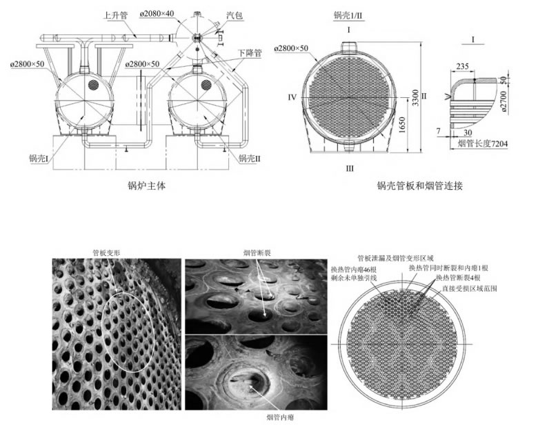 生產(chǎn)運(yùn)行中,余熱火管鍋爐泄漏常發(fā)生在前煙箱管板焊縫失效的位置,余熱火管鍋爐是由筒體和管板構(gòu)成,管板與火管之間采用焊接結(jié)構(gòu)。在管板焊接位置除承受設(shè)計(jì)壓力載荷外[1],還承受前煙箱高溫?zé)煔猓s1100℃)與鍋筒內(nèi)飽和水溫度(約250℃)差異較為明顯的溫度載荷,因此管板與火管的焊縫同時(shí)承受壓力 、溫度兩種工況下的應(yīng)力改變,在該位置產(chǎn)生最大應(yīng)力,當(dāng)運(yùn)行中管板焊接處出現(xiàn)腐蝕,將引發(fā)焊縫失效出現(xiàn)泄漏。