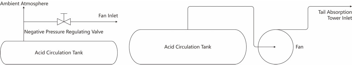 At present, the sulfuric acid production plant connects the drying circulation tank and the secondary suction tower circulation tank to the main fan inlet by using carbon steel pipes, and uses the negative pressure effect of the main fan to recover the generated acidic gas and reintroduce it to the acid production system to produce sulfuric acid. Since the circulating acid pump tanks of the drying tower and the secondary suction tower are lined with acid-resistant bricks, these bricks cannot withstand the vibration load, so the pump cannot be mounted directly on the pump tank, and a separate pump frame must be installed. Due to the irremediable gap between the pump frame and the pump tank, after some time of use, we found that the connection pipe could not achieve a complete seal with the dry pump seat and the secondary suction seat. As a result, hydrated air seeps into the pump tank through these gaps and mixes with the acid to form a dilute acid. The acid sludge produced after the dilute acid corrodes the pipe blocks the passage, resulting in the acid gas cannot be pumped to the main fan inlet. This eventually leads to the direct discharge of acidic gases into the atmosphere, causing serious pollution to the environment. In order to solve this problem, some sulfuric acid plants have improved the original waste gas recovery process and adopted the method of fan suction.