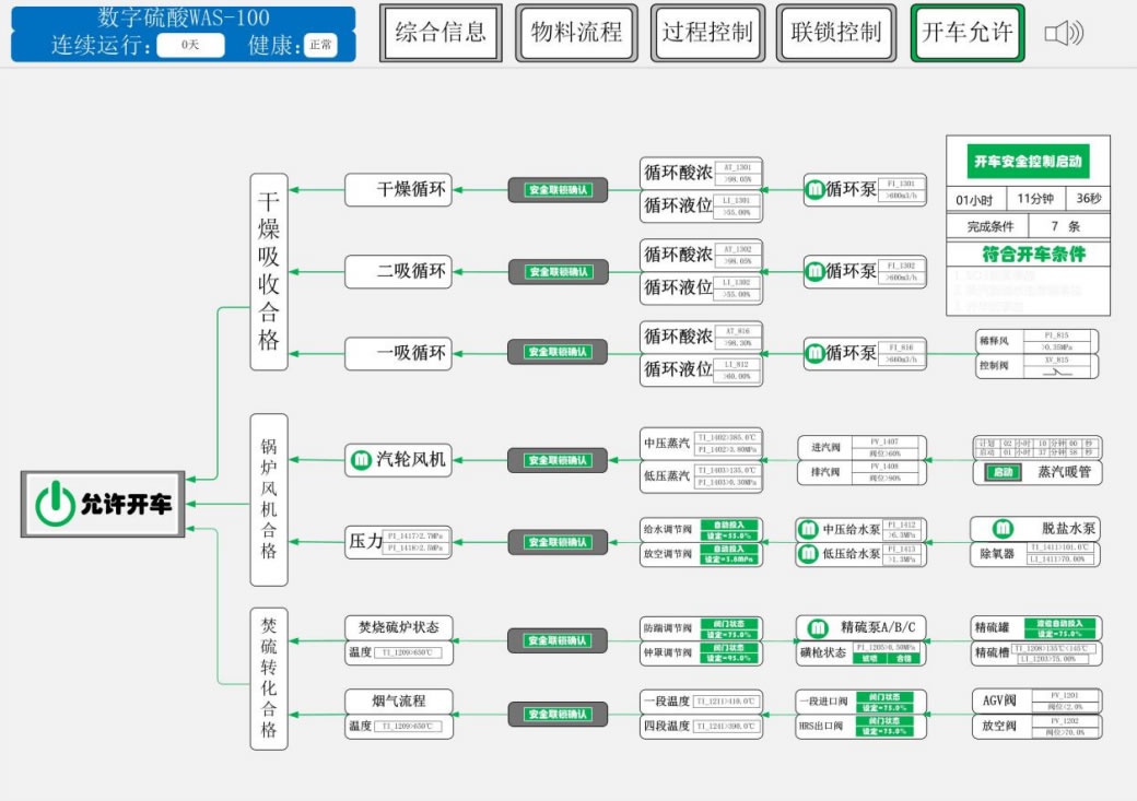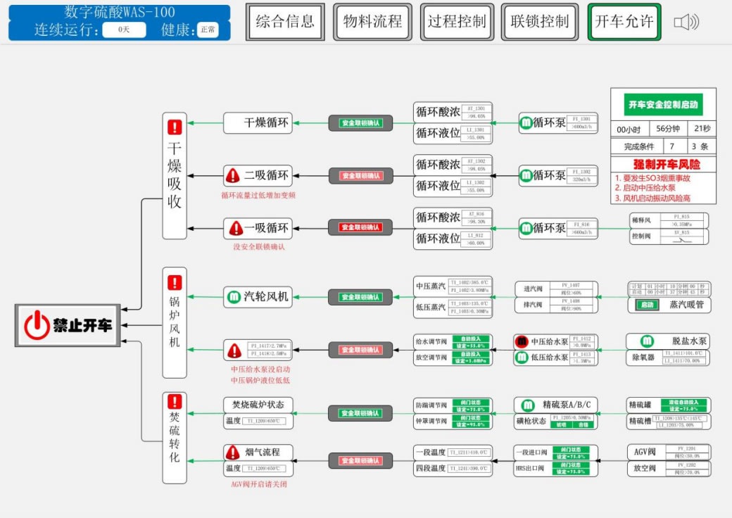 裝置在開車過程中往往是最忙碌和經(jīng)過檢修或者緊急處理后,操作人員往往需要對(duì)裝置的當(dāng)前狀態(tài)進(jìn)行多項(xiàng)人工確認(rèn),由于時(shí)間的緊迫感和高強(qiáng)度的操作會(huì)使操作人員在開車過程中身心疲憊難以精神高度集中,開車過程中的事故往往是在這種情況下發(fā)生,美國ASM(異常狀態(tài)管理協(xié)會(huì))研究,化工裝置引起異常狀態(tài)的原因有36%是設(shè)備故障引起,有22%是工藝引起,有42%是操作人員失誤引起。因此一套人機(jī)友好的開車安全自動(dòng)控制系統(tǒng)就顯得尤為重要,能指導(dǎo)操作人員自動(dòng)完成開車安全的自動(dòng)檢查,出現(xiàn)故障能協(xié)助操作人員完成故障排除,在開車前使裝置各關(guān)鍵條件100%滿足要求,有效防止人員失誤引起的開車事故發(fā)生,圖2為DSC-100硫酸裝置開車安全自動(dòng)控制系統(tǒng)在80萬噸硫磺制酸裝置上的控制畫面。
