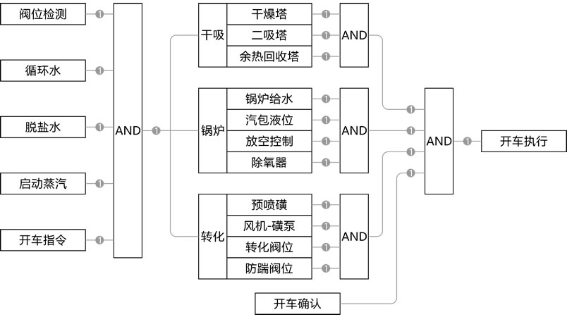 硫磺制酸裝置開車是一個(gè)復(fù)雜且漫長的過程,在這個(gè)過程涉及到開車準(zhǔn)備的順序、工藝參數(shù)的調(diào)整、裝置上控制閥的設(shè)置、以及開車前的所有條件確認(rèn),才能啟動(dòng)風(fēng)機(jī)噴硫磺開車,由于開車過程是裝置工藝流程從靜態(tài)轉(zhuǎn)變?yōu)閯?dòng)態(tài)過程工藝參數(shù)會(huì)發(fā)生劇烈的變化,當(dāng)裝置準(zhǔn)備不當(dāng)就會(huì)發(fā)生事故,因此,需要對(duì)開車過程進(jìn)安全控制。基于開車過程的變化,設(shè)計(jì)一套完善合理的控制邏輯非常重要。