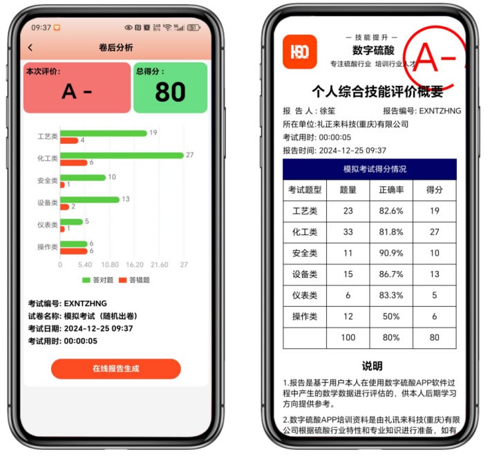 在模擬考試過(guò)程中,我們采用系統(tǒng)隨機(jī)抽取試卷的方式,將測(cè)試題目類型劃分為單選題、多選題、判斷題和填空題??忌柙谝?guī)定的時(shí)間內(nèi)完成所有題目,并提交試卷以計(jì)算總分。點(diǎn)擊“在線報(bào)告生成”按鈕后,即可生成“個(gè)人綜合技能成績(jī)表”。