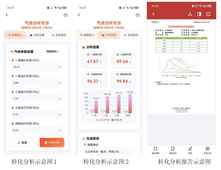 我司全新推出的“轉(zhuǎn)化分析”功能,專為精細(xì)化評(píng)估轉(zhuǎn)化器運(yùn)行效能而設(shè)計(jì)。在“數(shù)據(jù)輸入”版塊,用戶可根據(jù)實(shí)際工藝情況,選擇四段或五段轉(zhuǎn)化模式,并輸入各段出口氣體濃度,系統(tǒng)將依據(jù)專業(yè)計(jì)算公式,精準(zhǔn)得出每段的轉(zhuǎn)化率;在“分析結(jié)果”版塊,將為您提供清晰的數(shù)值結(jié)果與趨勢(shì)圖表,全面展現(xiàn)各段轉(zhuǎn)化效率及轉(zhuǎn)化器各層的健康運(yùn)行狀態(tài);在“生成報(bào)告”版塊,支持生成結(jié)構(gòu)化檢測(cè)報(bào)告——涵蓋測(cè)量單位、檢測(cè)地址、裝置工況、工藝流程、裝置負(fù)荷等關(guān)鍵信息,并允許檢測(cè)人員添加專業(yè)建議,形成完整、可追溯的檢測(cè)閉環(huán)。