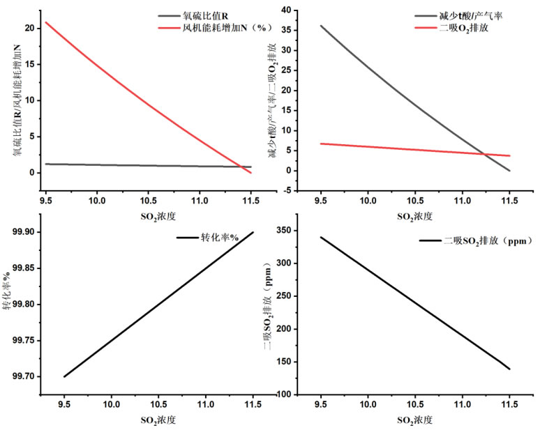 國(guó)內(nèi)硫磺制酸裝置的設(shè)計(jì)通常設(shè)定在二氧化硫濃度f(wàn)(SO2)為11.5%,這對(duì)應(yīng)著一個(gè)特定的氧硫比值R=0.824。然而,每套裝置的理想氧硫比值實(shí)際上取決于裝置的特定屬性,包括所使用的催化劑類(lèi)型、轉(zhuǎn)化器的氣體流速、風(fēng)機(jī)的壓力以及工藝流程等因素。這些因素最終決定了二吸塔出口的二氧化硫排放濃度。該排放濃度受轉(zhuǎn)化率的影響,而轉(zhuǎn)化率下降的主要因素是轉(zhuǎn)化器內(nèi)氧含量的降低。因此,最佳氧硫比值的確定點(diǎn)是裝置經(jīng)濟(jì)性能最優(yōu)的時(shí)刻,此時(shí)裝置所需的最小氧量(空氣)與硫的比值即為最佳氧硫比值。圖2展示了裝置轉(zhuǎn)化率的環(huán)保經(jīng)濟(jì)性與裝置能效之間的對(duì)應(yīng)關(guān)系,每套裝置都可以根據(jù)自身的特性來(lái)選擇最適宜的氧/硫比值R。